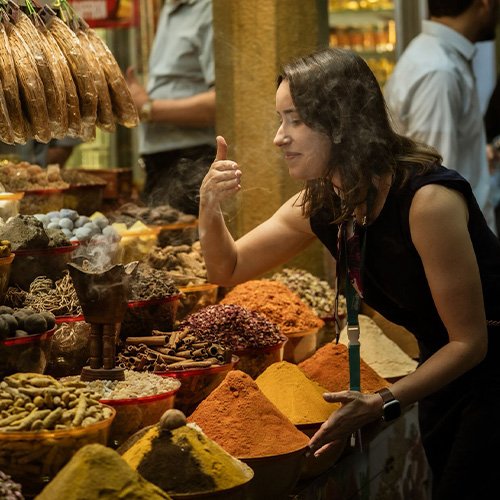 Um mercado vibrante cheio de aromas e sabores únicos do Oriente Médio. Onde encontramos as especiarias mais usadas no oriente como o açafrão e o cardamomo.